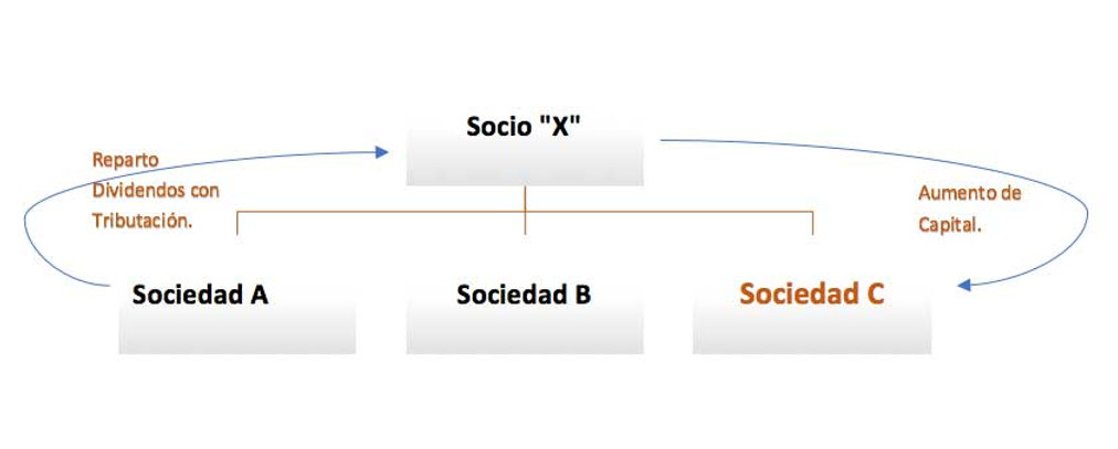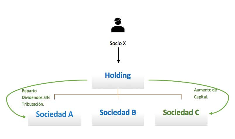 La sociedad A, con actividad económica, tiene unos excedentes de tesorería elevados, y el socio desea iniciar una nueva actividad completamente distinta a la que desarrollan las sociedades A y B y quiere crear una sociedad tercera, “Sociedad C” a la que inyectar la tesorería para hacer las inversiones necesarias para poner en marcha el negocio nuevo.